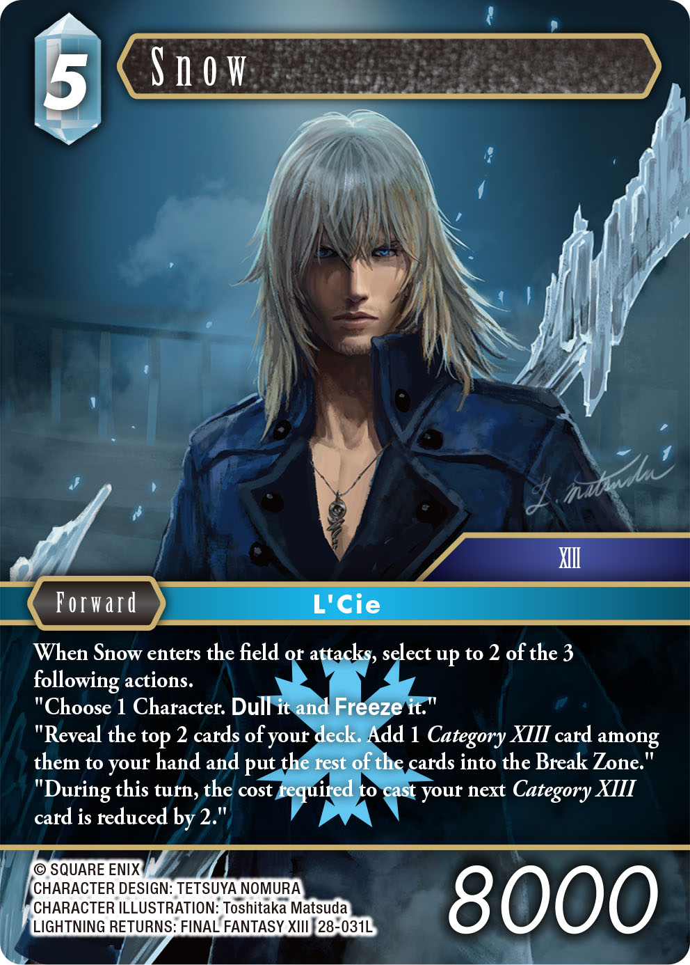 It is my turn again to introduce a new card from the upcoming booster pack Dreamlike Oceans, scheduled for release on 27 March. I hope you enjoy this week’s feature! The card I am showcasing today is Snow [28-031L] from LIGHTNING RETURNS: FINAL FANTASY XIII. This illustration is a brand new piece created by Toshitaka Matsuda. Snow [28-031L] looks incredibly cool, so I hope you will have the chance to pick up the Full Art version and enjoy its commanding presence in your collection.