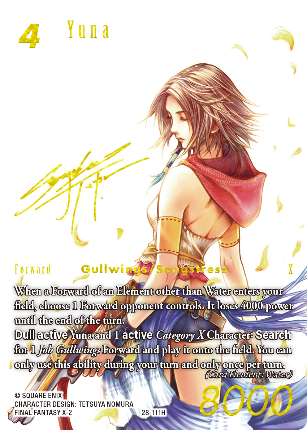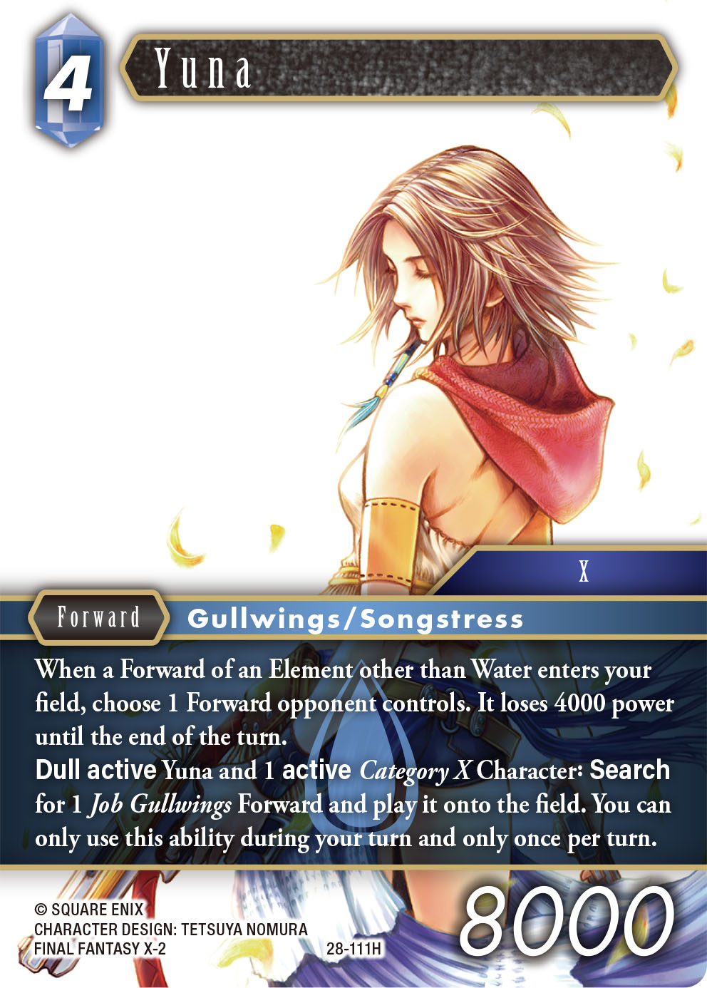 Yuna [28-111H] is a Water element Forward with 8000 power and 4 CP, making her a mid-sized Forward both in terms of cost and power. Yuna [28-111H] possesses a total of two abilities, an Auto Ability and an Action Ability, so I’ll break her down by focusing on each.